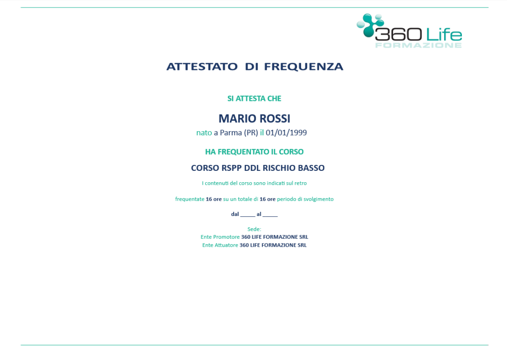 Il corso RSPP DDL rischio basso è organizzato e progettato da 360 Life Formazione secondo quanto previsto dal D.Lgs. 81/2008 e dall’Accordo Stato Regioni del 7/7/2016.