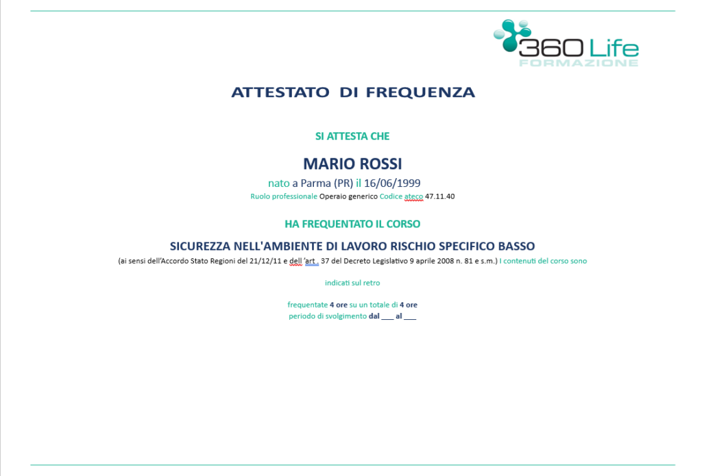 L’attestato ha una validità di 5 anni, trascorsi i quali dovrai effettuare il corso di aggiornamento per mantenere la formazione conforme alle normative vigenti e garantire la continua sicurezza all’interno dell’ambiente di lavoro.